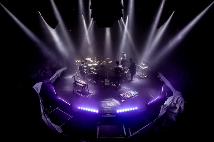 M’n fiets is snel neergezet en even later loop ik de tent binnen. In het midden een groot wit doek over het podium, en door de zaal een mooie spanning: wat gaan we beleven? Om negen uur wordt de tent donker, klinken de eerste tonen en zakt het doek. Daar staat de band… midden in de tent in een cirkel.